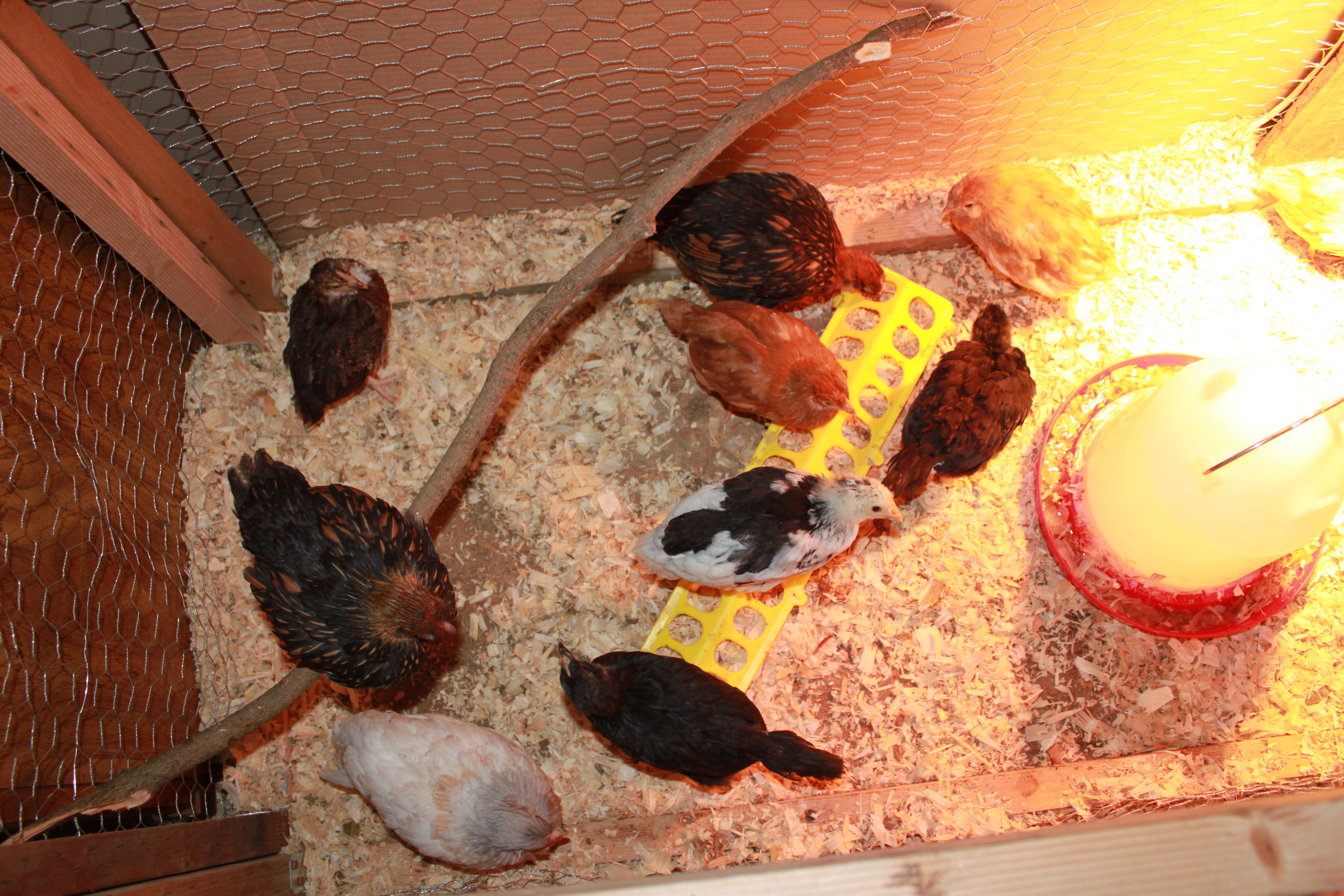 While I want to make a nice soft warm bed of pine shavings for the girls, they continually kick it out until it’s almost just bare board. See the shavings in their water? This water had just been changed 10 minutes before I took this picture. They’ve also taken to sitting on their feed. Not sure why. There are two who often roost on the stick, but the others? Maybe there is not enough room? Or they’re only brave enough to be as high as the feeder. Maybe there is something to calling someone a ‘chicken’ when they’re fearful?